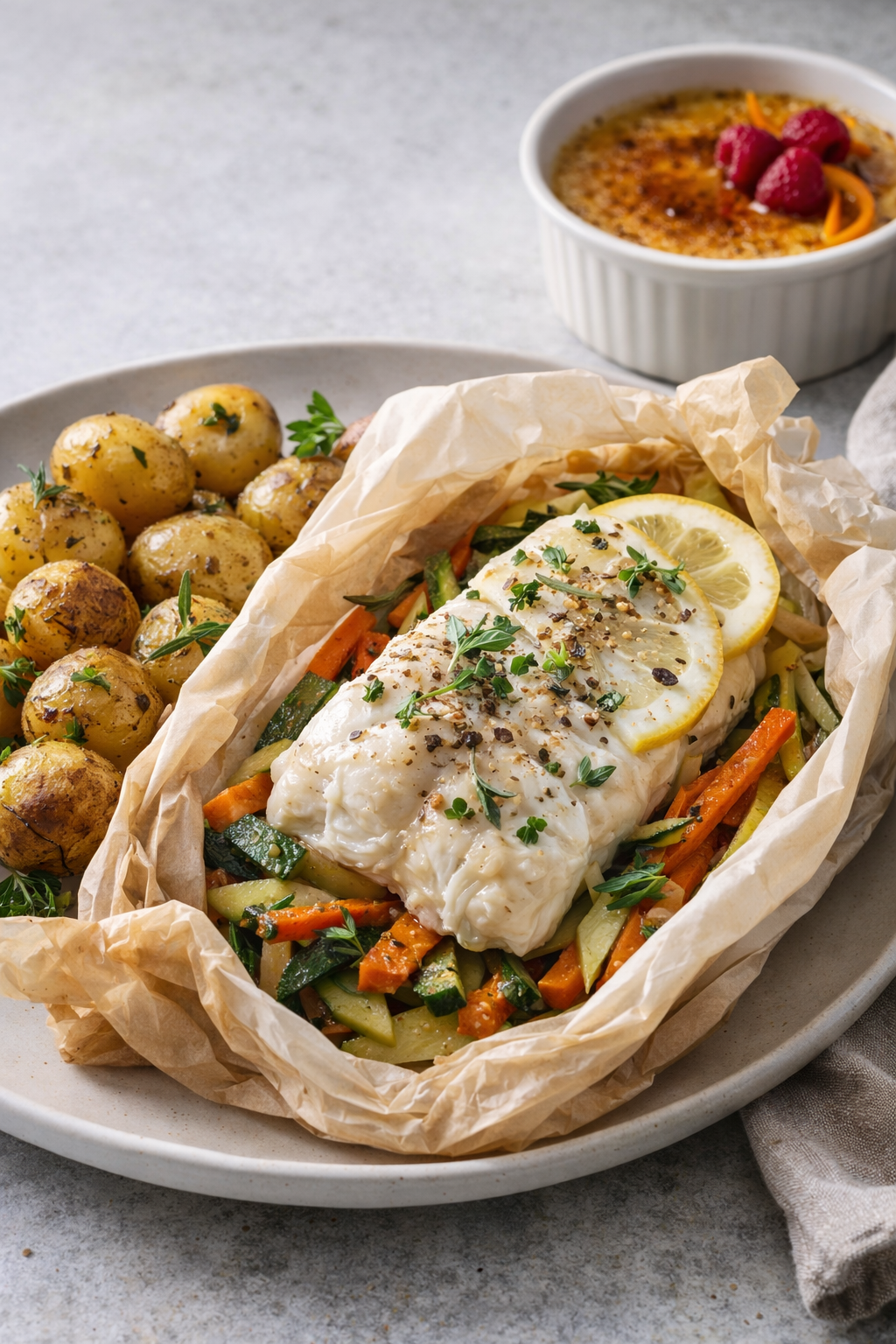 Poisson de la cuisson en papillote et des légumes croquants & ses pommes de terre rôties dorées.